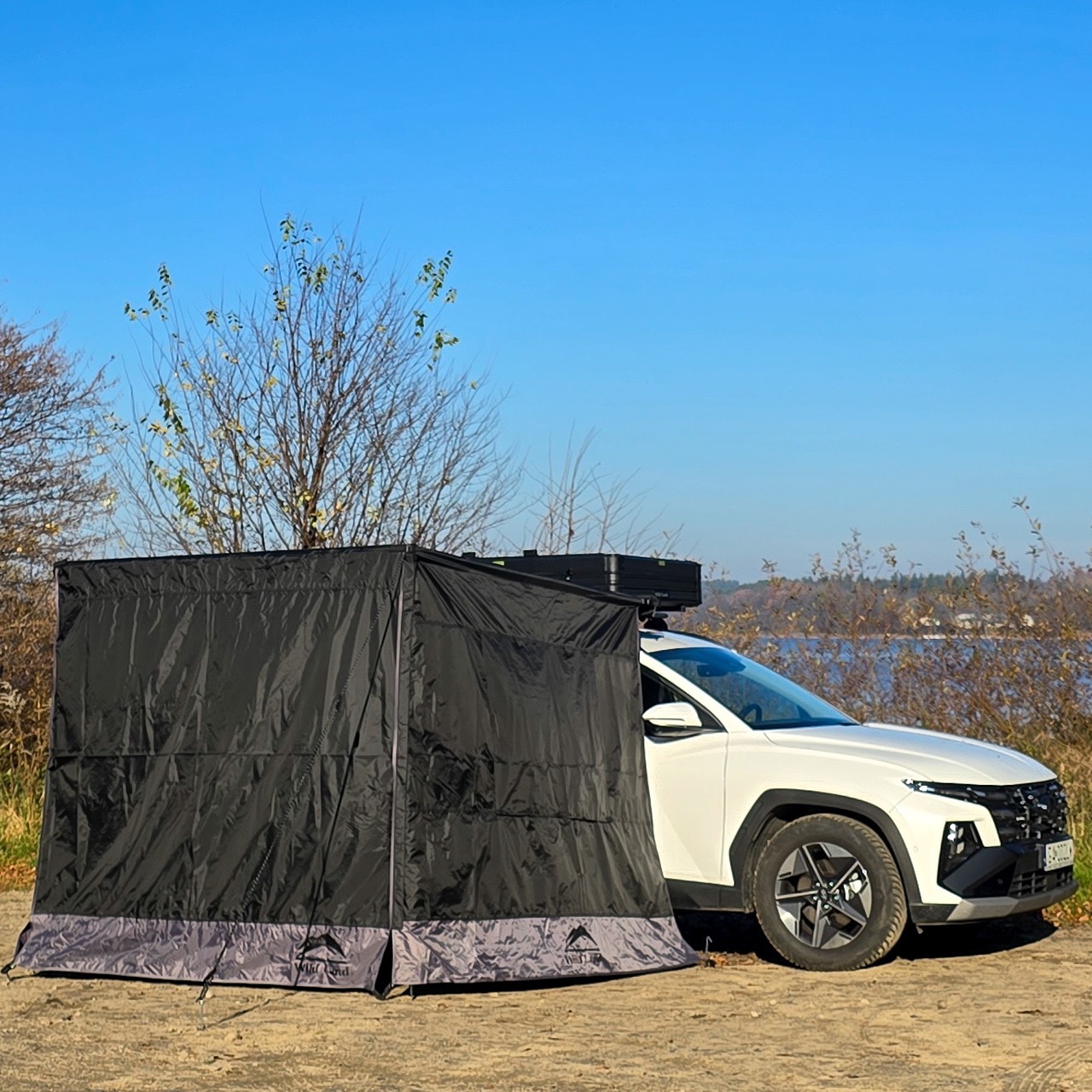 A set of attachable side walls and a front wall can be purchased separately. In the evening, by closing the space under the awning, you get the perfect place to change clothes, store camping equipment, or sit comfortably, sheltered from the wind and insects.