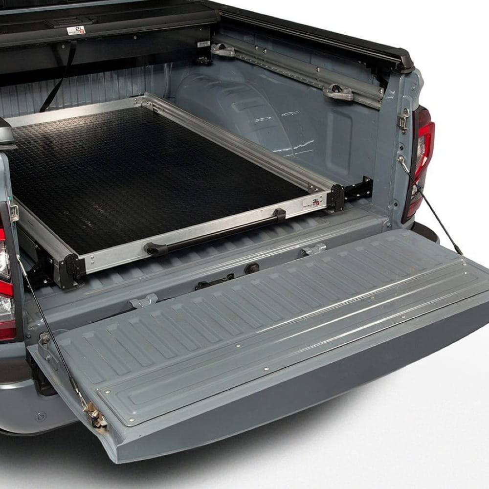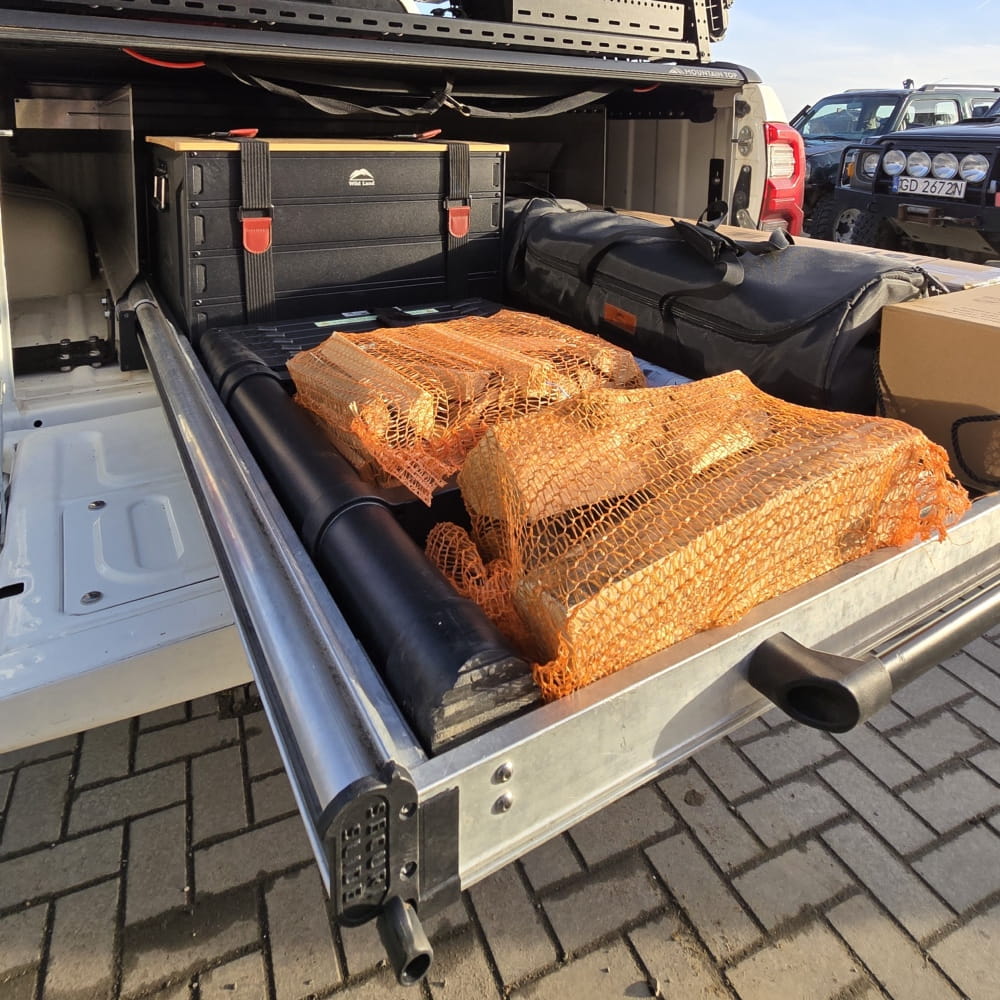 Idealnie odgradzają przestrzeń pomiędzy ścianami paki a szufladą i dodatkowo pozwalają wykorzystać miejsce z nadkolami na przechowywanie innych akcesoriów czy sprzętu. Burty są częścią nieruchomą (nie wysuwają się z szufladą), pomagają w organizacji, aby nic nie spadało z platformy przy dużej ilości przewożonych rzeczy.